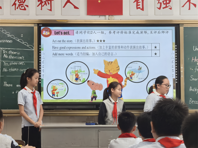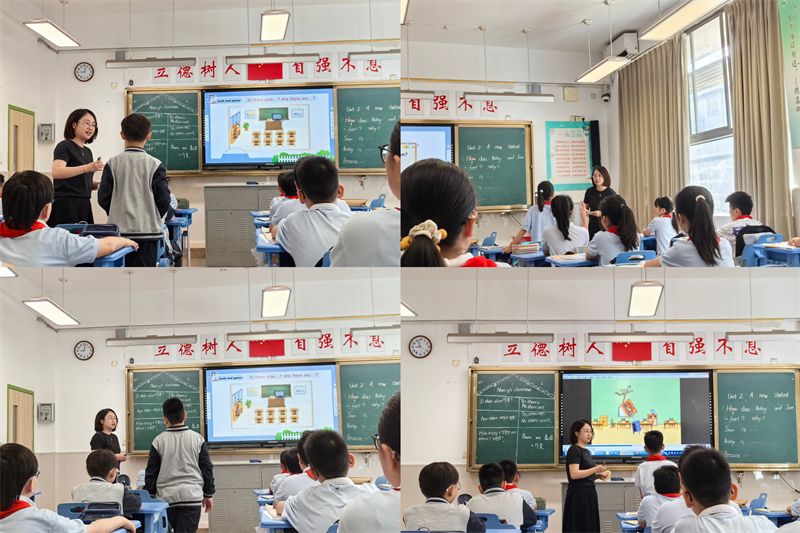 课始,孔老师通过一首与本课主题相关的歌曲《What's in the classroom?》导入本节课的学习,迅速点燃了孩子们的学习热情,大大激发了学生的学习兴趣。孩子们在边唱边做的活动过程中,快速地融入了整节课的学习氛围中,轻松且活泼,紧接着教师呈现“Fun time”版块的图片,让学生初步尝试着猜Nancy教室物品,并试着用“Is there...?/Are there...?/How many...?”等核心句型进行问答操练,培养了学生灵活运用语言流利、准确表达与交际的能力与水平。而对于图片的闪现与消失,短时记忆,制造信息差等有梯度的活动,更是激发了学生的表达欲,让学生在真实的语境中熟练运用语言,大大促进了学生核心素养、综合能力的提升与发展。孩子们根据语言支架,深入交流教室细节,他们一个个举手踊跃,课堂氛围浓厚,孩子们流利且完整的精彩回答,充分凸显了孩子们的整体素质与英语水平。本节课的精妙之处还在于孔老师创设新同学Nancy找不到她的教室这个情境,巧妙串联三个板块,环节与环节之间环环相扣,衔接过渡自然。“Culture time”版块注重渗透中西方文化及西方不同国家的相关文化,学生们通过观看英、美两国及中国特色城市-重庆等楼层描述的相关视频,直观感受英美楼层及国内楼层的表述差异,拓展了学生的文化视野,大大激活了学生的英语思维,同时体验了文化的多样性,培养了学生比较中外文化异同的能力。而孔老师基于“Cartoon time”版块创设的幽默风趣的课堂活动更是将本课推向了高潮。学生跟随Bobby和Sam的秋千故事,在听读、模仿、填空等一系列多模块的综合性语言活动中既感受到了语言表达的风趣,同时又很好的激发了学生的英语思维,孩子们通过“演、读、诵、艺”等环节出色的演绎了Bobby和Sam两个人物角色,孩子们的表演惟妙惟肖,趣味盎然,尤其是给图片选取相应的标题这一环节更是体现了学生们丰富的词汇素养与综合性运用语言的能力。孩子们不同视角选取的标题既生动又风趣,达到了语言广度与深度的有机统一。而本版块孔老师还注重培养学生的安全意识,引导学生在游戏和运动时注意个人安全防护,启到了很好的育人效果。