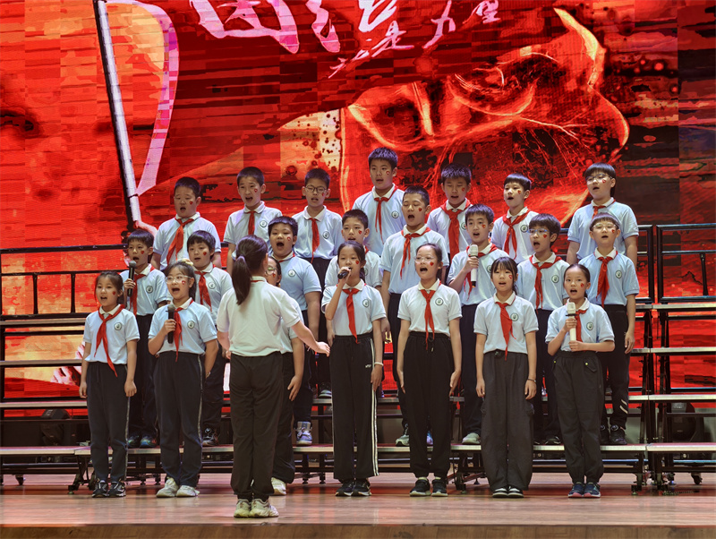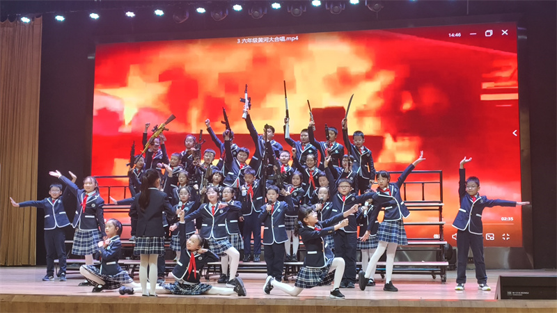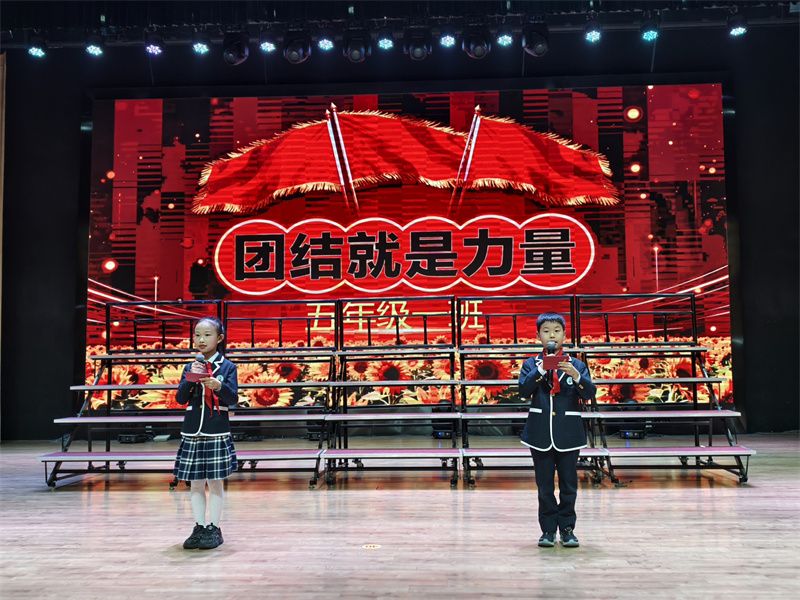比赛以班级为单位,全体学生参与,共有五个班级依次登台献唱。各班从年级组提供的15首备选曲目中精选一首,结合朗诵、舞蹈、道具等多种形式,呈现出丰富多彩的舞台效果。五(1)班以《团结就是力量》展现班级凝聚力,四年级用《游击队之歌》传递少年的朝气,六年级的《黄河大合唱》更是气势恢宏,赢得阵阵掌声。五(2)班则以一曲铿锵有力的《没有共产党就没有新中国》,表达了孩子们真挚的情感;三年级的同学们则用活泼欢快的《打个胜仗哈哈哈》,唱出了少年的朝气与斗志。