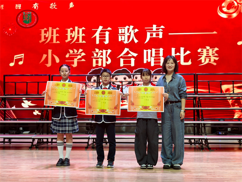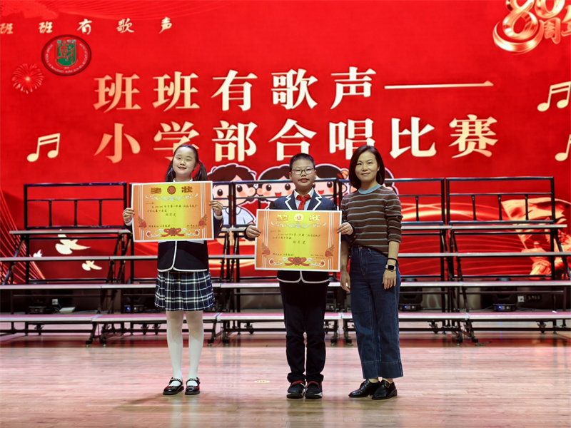 整场比赛秩序井然,气氛热烈。各班服装统一、队形美观,伴奏与动态大屏背景相得益彰,展现出良好的舞台素养与班级文化。班主任积极参与指挥,更为演出增添亮点。经过艺术组老师的公正评审,最终评选出特等奖2名、一等奖3名。