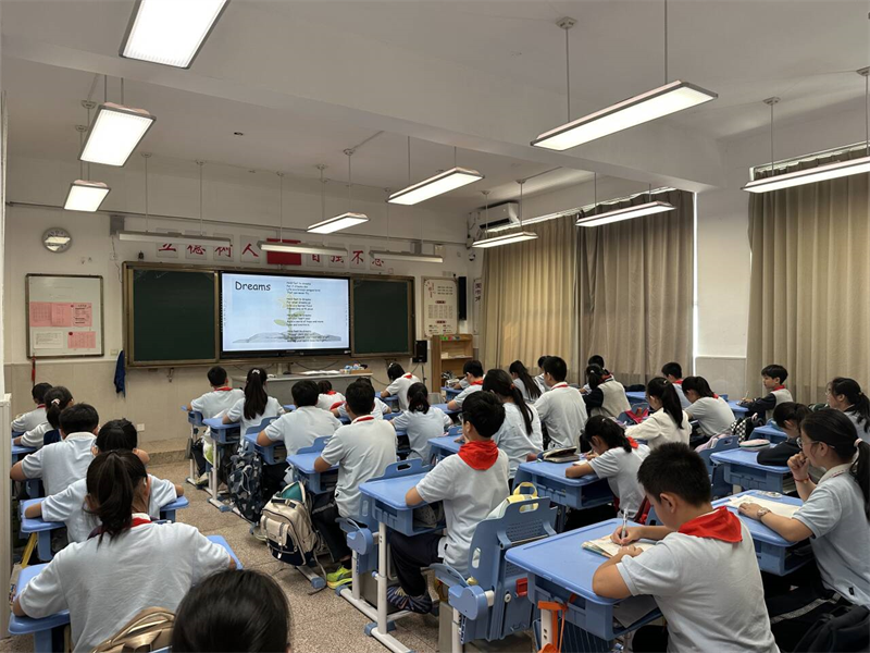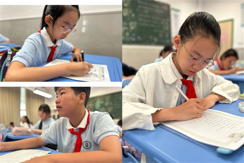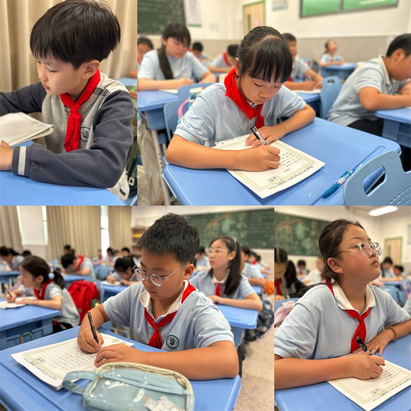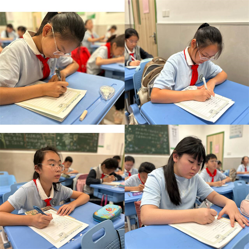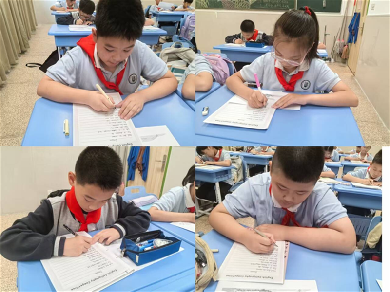 比赛前期,各班级积极动员,英语老师结合不同学段特点开展针对性指导:周媛媛、刘瑞萍老师为三、四年级同学拆解诗歌What is pink中基础字母的占格与单词间距,帮助他们用工整书写还原“颜色”的灵动;王烨,孔心怡,周露老师为五、六年级同学梳理Dreams的句式节奏,引导他们在书写中传递诗歌里“梦想”的力量。同学们利用课余时间反复练习,从调整一个字母的倾斜角度,到把握一句诗的换行节奏,每一份努力都凝聚着对“写好英语、读懂诗意”的执着。