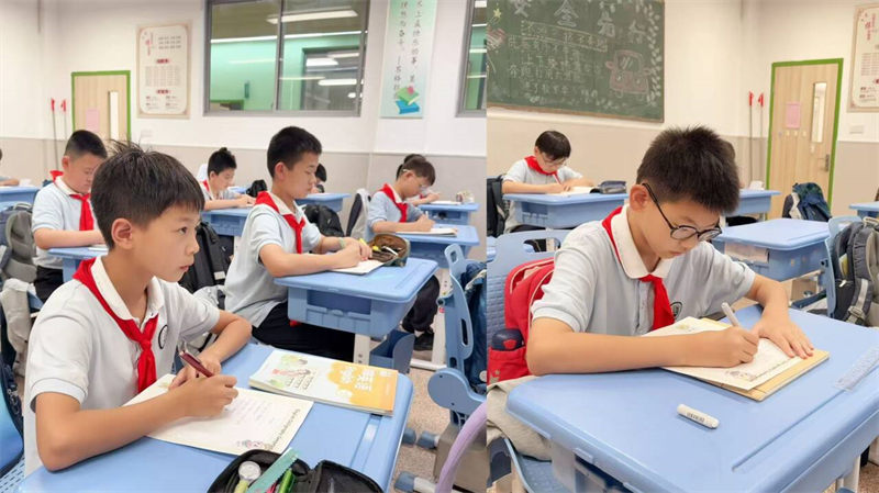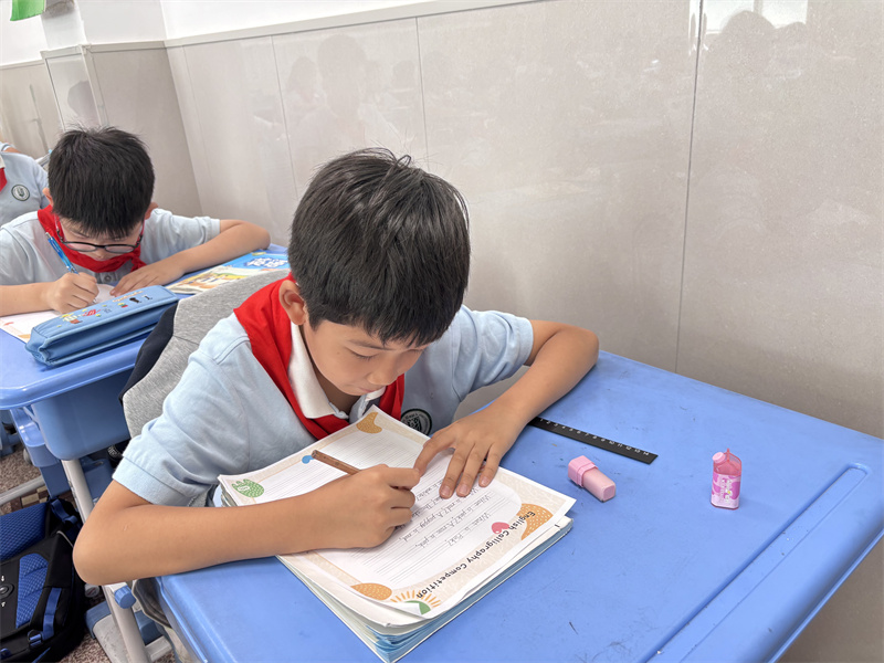 有的同学紧握笔杆,对照诗歌范例调整书写节奏;有的同学写完后轻声诵读诗句,再用橡皮轻轻修改细节,让书写与诗意完美融合。一张张作品不仅展现了扎实的书写功底,更传递出对英文诗歌的喜爱与严谨细致的学习态度。