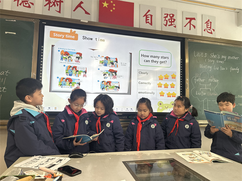 在充分的知识输入后,周老师通过“整体跟读——关键词遮挡复述——集体朗读” 的三步法,搭建了坚实的语言支架,逐步培养学生的语感和表达能力。随后,课堂迎来了高潮——小组角色表演。学生们兴致盎然,在合作中练习,在表演中体验,将静态的文本转化为生动的场景。表演后的生生互评环节,更是培养了学生的倾听与批判性思维能力。