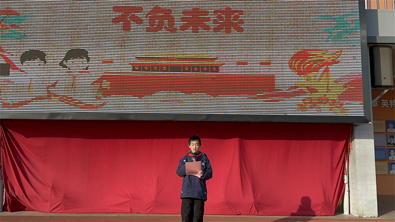 张以安同学以12月13日南京大屠杀死难者国家公祭日为引,回顾了80多年前山河飘摇的历史,讲述先辈们以血肉之躯守护和平的壮举,更将“不负未来”落于少年的日常:上好每一堂课、写好每一个汉字、珍惜每一粒粮食,都是对历史的铭记,对先辈的回应。他的发言真挚而有力量,赢得全场热烈掌声。