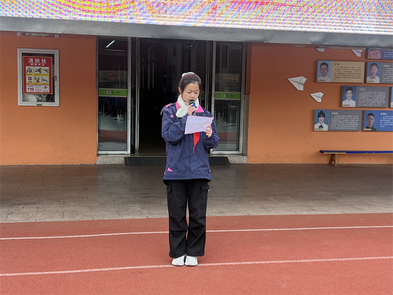 本次升旗仪式由孙慕妍同学担任主持人。她以“梦想是藏在平凡日子里的星光”开启仪式,清脆的嗓音里满是少年对梦想的理解与憧憬。从宣布升旗议程,到介绍班级追梦的精神风貌,再到引出国旗下讲话,她的主持从容流畅,将“追逐梦想,全力以赴”的主题悄然融入每一个环节,让仪式的庄重与青春的热忱相融相生。