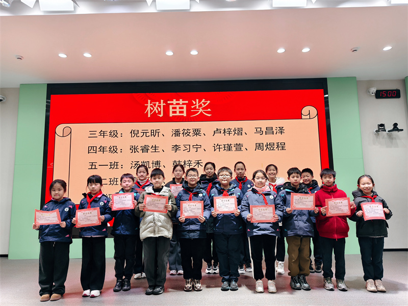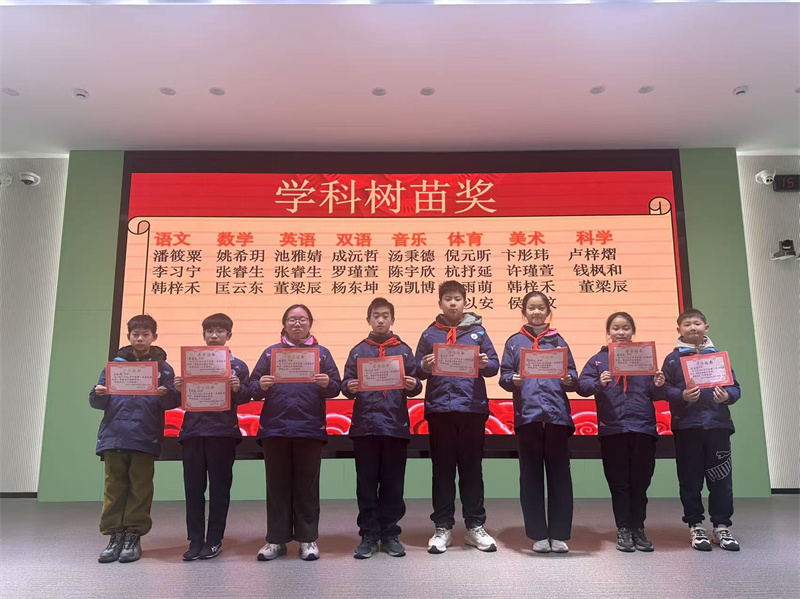 最后班主任老师现场颁发单项学科树苗奖,并和获奖者们合影留念;主持人宣读树苗大奖得主名单,郑金平主任为获奖者们颁奖并合影。