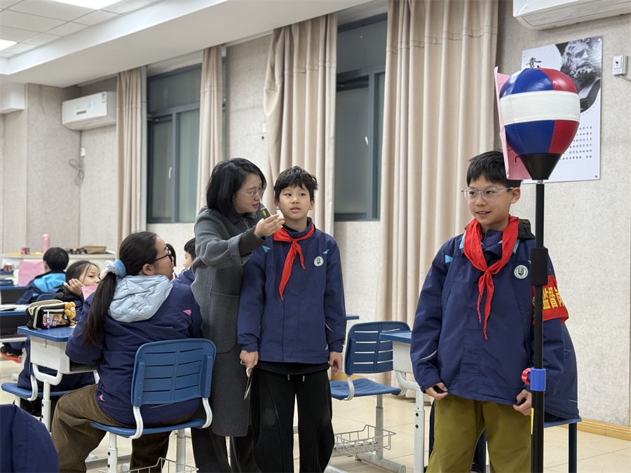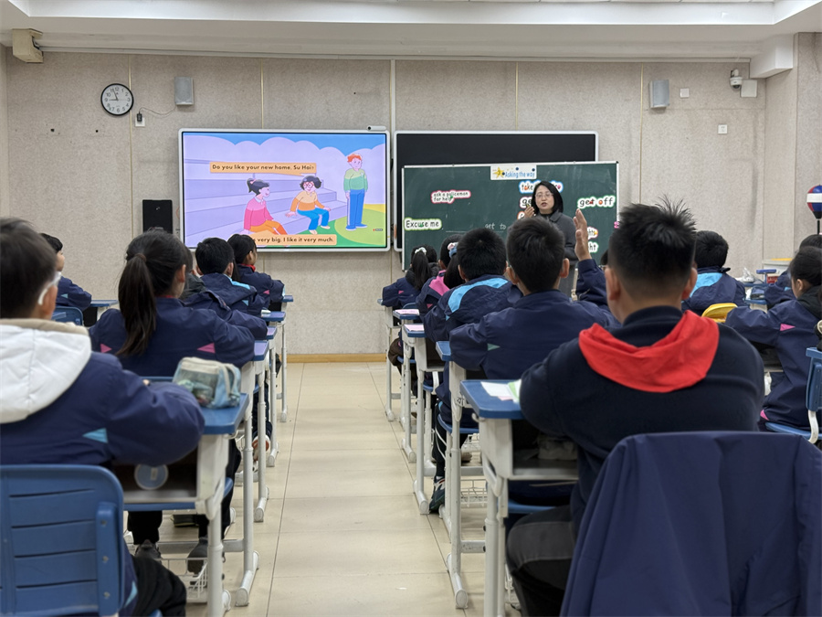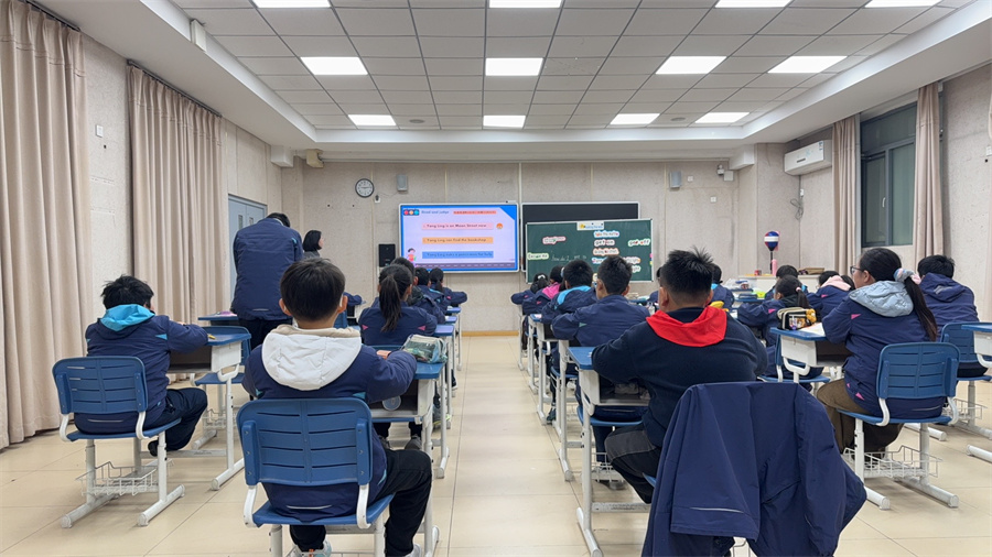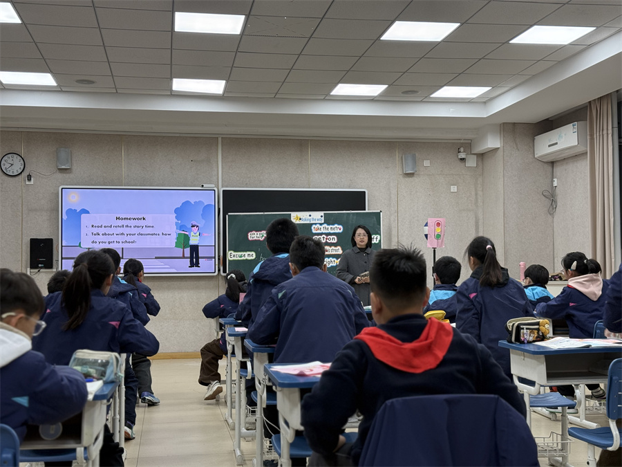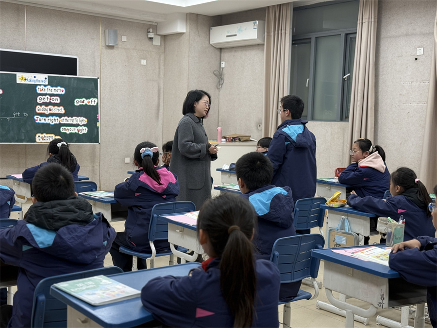 孩子们两两结对,在未来教室的模拟场景中穿梭互动:有人询问去瘦西湖的路线,有人指引同伴前往山姆超市,生动的对话、夸张的手势,让原本枯燥的句型操练变成了充满趣味的生活实践。大家在互帮互助中,不仅熟练掌握了问路与指路的核心表达,更提升了口语交际的勇气与自信,真正实现了中“能在语境中流利朗读、复述路线”的教学目标。