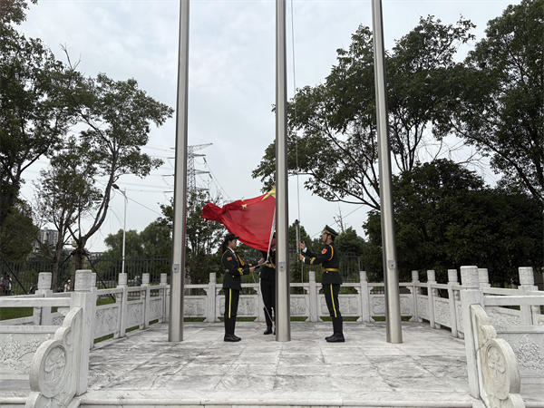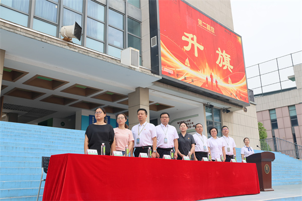 国旗班的同学们迈着稳健的步伐,五星红旗随着庄严、肃穆的国歌迎风飘扬。