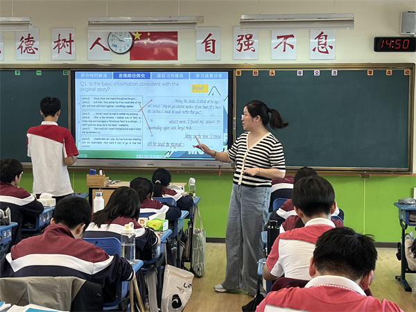 本次公开课教学设计严谨,环环相扣。课堂伊始,鲍老师首先对高考读后续写的评分细则进行了精准而深入的解读,帮助学生从阅卷者的视角明确“好故事”的标准,为后续学习奠定了坚实的理论基础。紧接着,课堂进入核心环节——“思维路径探究”。鲍老师通过巧妙的提问和引导,带领学生从解读原文关键信息、分析人物性格与情感变化、推断情节合理发展方向到最终确立故事主题立意,一步步抽丝剥茧,构建起一个科学、清晰的审题立意思维框架。她强调,精准的审题和深刻的立意是续写成功的根本,避免了学生写作时陷入“天马行空”或“偏离主题”的误区。在“课前习作修改”环节,鲍老师选取了具有代表性的学生习作作为案例,组织学生运用刚探究出的思维路径进行集体诊断和修改。学生们积极参与,在对比、分析和优化中,切身感受到了审题立意对提升文章质量的显著作用,实现了从知识理解到实践应用的有效转化。课程最后是“学习成果分享”阶段。学生们自信地展示了修改后的续写片段,并分享了他们在本节课中的收获与感悟。