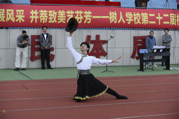 接着是高二(1)班毛梓淇、高二(5)班王怡涵、高一(3)班王泽宇带来的中国舞串烧《青与白》《拉岗踏歌》,翩若惊鸿。