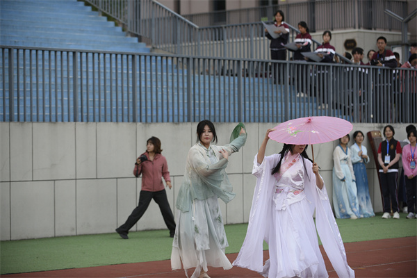 高一年级家委代表朱恩燕女士和高二年级家委代表赵华女士分别为本次运动会入场式中获得最佳精神面貌奖和最佳表演奖的班级颁奖。