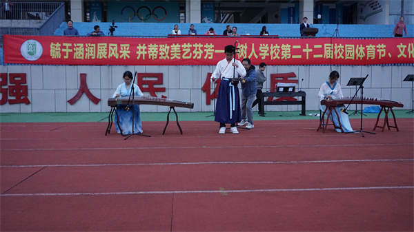 第三个节目是由高一(1)班黄瀚瑶、徐语萱,高一(3)班郑煜珩,高一(4)班李崔恺,高一(5)班赵敏睿、朱韦昶、崔华倩,高一(7)班王腾悠、高子轩组成的中西乐队带来的《青花瓷》《追光者》,体现出旋律与和声碰撞出的戏剧性与生命力。