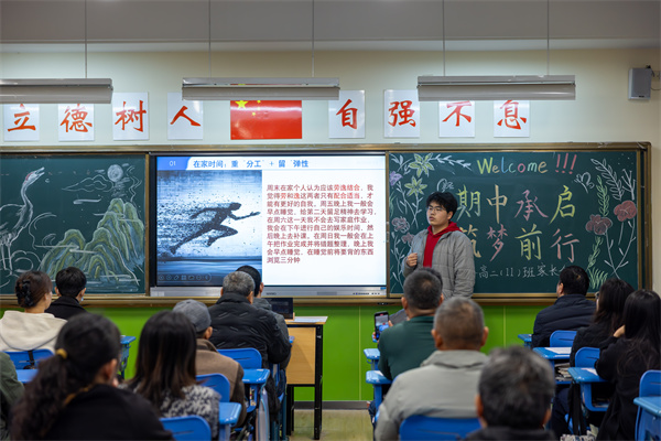 集体会议结束后,家长移步至各班级教室,与班主任及任课教师开展分班交流。班主任介绍本次期中考试的整体情况,并告诉家长要正确、理性地面对学生的成绩,将对成绩的过度关注转移到学生的生活态度、生活习惯、责任意识、品德教育等方面。接着学生代表发言,学生真挚诚恳的发言赢得了在场所有人的热烈掌声。随后,各主要学科的任课教师依次进入班级,与家长进行零距离交流。每门科目的老师分别结合本学科特点,介绍了高中的学习要求、教学方法,并详细分析了学生在该学科上的整体表现和期中考试中暴露出的共性问题。老师们不仅分享了有效的学习方法指导,如如何记笔记、如何高效复习等,还就家长如何配合学科学习提出了具体建议,例如鼓励阅读、督促基础知识的巩固等。
