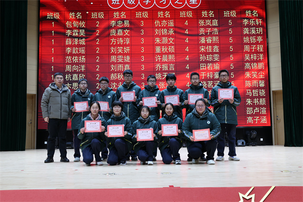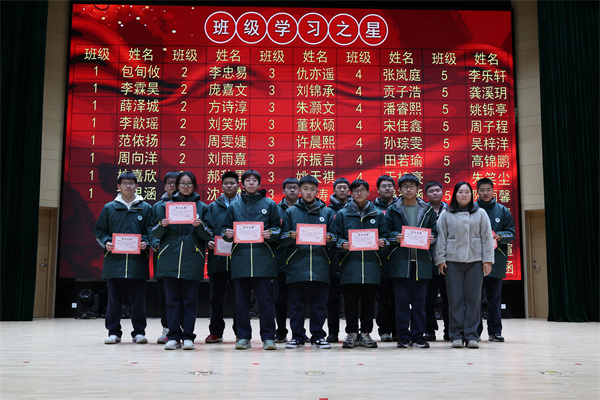 会议第一项议程,阶段测试表彰。经过严谨评定,理科方向年级前18名、文科方向年级前2名的20名同学荣获“年级学霸”称号,他们以扎实的学识和不懈的努力在知识的海洋中独占鳌头;王力彬、朱笑尘等9名同学凭借单科年级第一的优异成绩,获评“单科之星”,展现了在特定学科领域的超凡实力;各班级1名“学习之星”代表上台领奖,他们作为班级标杆,以脚踏实地的态度诠释着坚持的力量。与会领导为获奖同学颁发荣誉证书并合影留念,现场掌声雷动,既是对获奖者的祝贺,更是对全体同学的激励。
