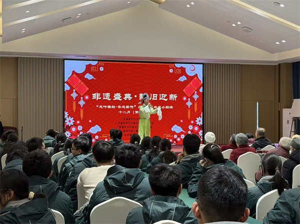 下午3时30分,活动在玖龙湖医养健康城7号楼三楼多功能厅正式开始。现场气氛热烈,座无虚席,洋溢着浓厚的文化气息与温馨的节庆氛围。一系列扬州非遗节目依次精彩呈现:木偶戏《板桥画竹》表演灵动传神,生动刻画出郑板桥笔下竹子的风骨与意境;扬州清曲《扬州是个好地方》曲调婉转,唱出了古城深厚的历史底蕴与人文风情;古筝独奏《雨碎江南》琴音细腻,如江南烟雨般勾勒出静谧悠远的画卷;扬剧选段《传诗约》韵味十足,展现了地方戏曲的独特魅力;琵琶演奏《春江花月夜》旋律悠扬,引人步入诗情画意的古典之境。每个节目都凝聚着非遗传承人的匠心与热忱,赢得了现场观众的阵阵掌声。