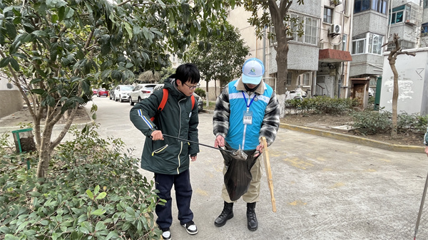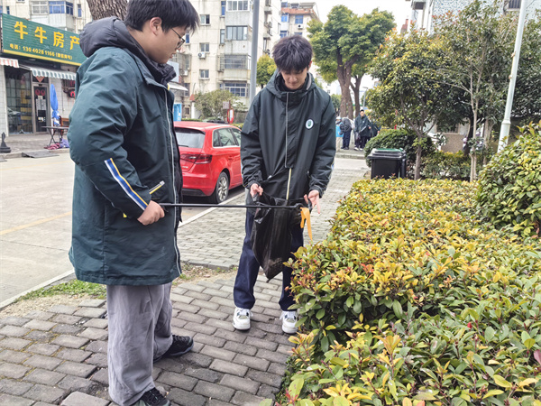 上午九时,同学们准时在社区广场集合。在社区工作人员的统一协调下,全班分为四个小组,划分责任区域,配备垃圾夹、垃圾袋等清洁工具,随即有序展开清洁工作。