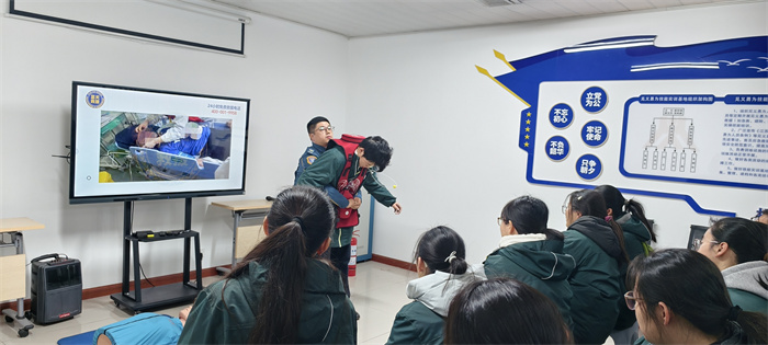 随后,同学们移步培训教室,聆听火灾灭火、心肺复苏、海姆立克法急救、AED使用等专题讲解。救援队教官邀请同学上台做示范,详细拆解有关海姆立克法的相关步骤:“用双臂环绕其腰部,一手握拳,拇指侧置于肚脐上方两横指处,另一手抱住拳头。”队员一边操作一边强调要点。同学们目不转睛,不少人跟着手势模拟练习。最令同学们感兴趣的是自动体外除颤仪(AED)的使用教学。“AED其实并不复杂,开机后按语音提示操作即可,它是挽救心源性猝死的重要设备。”教官拆解操作步骤后,不少同学发出感慨:“原来看似复杂的设备操作起来竟如此简单,在危急时刻竟能发挥如此大的作用。”