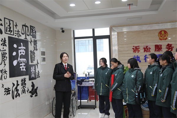 下午2点,同学们怀着好奇与敬畏之心走进邗江法院。在工作人员的引导下,师生们先后参观了诉讼服务中心、少年案件审判庭等场所。工作人员用通俗易懂的语言向同学们讲解了法院的职能、立案流程以及法徽、法袍、法槌的象征意义,让大家对法院工作和法律文化有了初步的感性认识 。