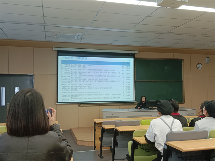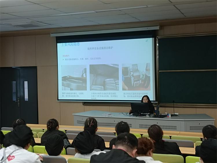 当日下午,培训在凤栖湖校区正式举行。王欣副局长受邀担任主讲,学校后勤负责人、食品安全员、食堂经理、厨师长、操作员参与培训。王局长围绕食堂日常管理的风险防控,从食品采购索证索票、入库查验、储存温控、加工操作规范、餐具清洗消毒到食品留样全流程进行了细致讲解。针对学校食堂供餐量大、品类多的特点,专家重点强调了生熟分开、烧熟煮透、防止交叉污染等关键控制点,并结合实际案例分析了常见问题的成因与整改措施。