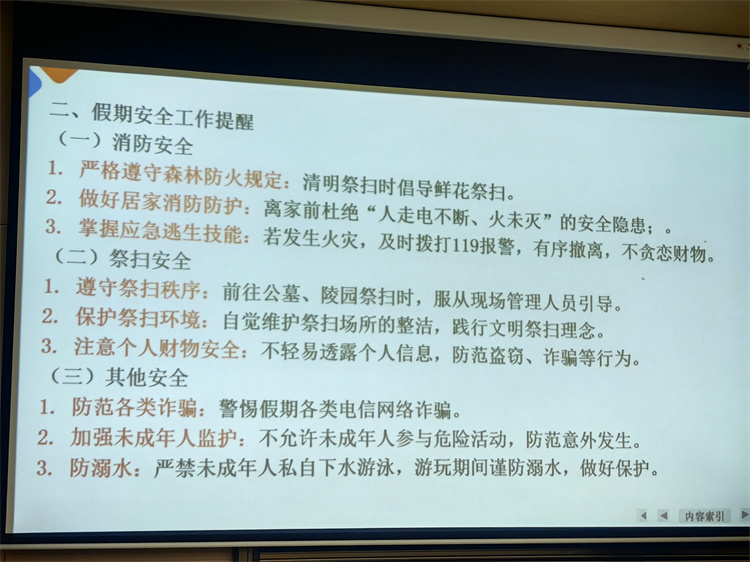 此外,学工处就清明假期安全工作进行部署,强调做好春季传染病防控、心理健康关爱、消防及祭扫安全、防溺水等工作,要求各班落实“1530”安全教育机制,假期每日执行安全“零报告”制度。