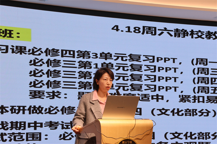 随后,教科室王健老师就教学常规推进与期中考试安排做专题发言。他带领全体教师重温集体备课制度、课堂教学要求、作业管理规范及听课评课制度,直面当前教学常规落实中存在的形式化、碎片化问题。他强调,要以“常规提质、教研提效”筑牢学校质量生命线,坚持“常规”固本、“规范”增效。针对即将到来的期中考试,他作出具体部署,明确复习阶段应坚持“课堂提质、课后减负”原则,号召全体教师深耕课堂,扎实推进教学。