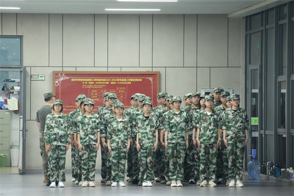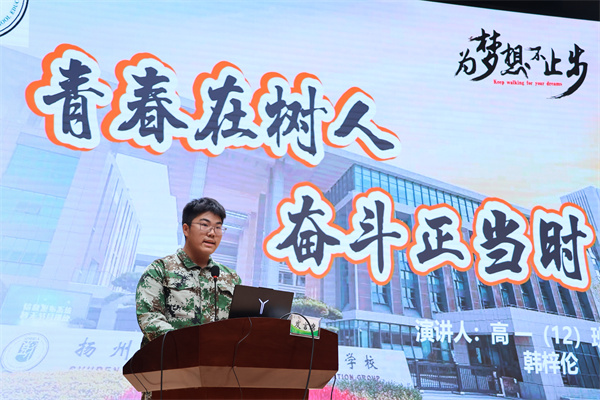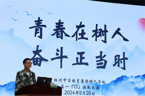 云天收拢夏色,秋意晕染迷彩。扬州市树人高级中学2024级高一军训第五天,一场大雨浇散暑气,却浇不散少年心中意气。“左脚清华,右脚北大!”“乘风破浪,舍我其谁!”“腾渊试翼,亮我锋芒!”训练场上的同学们英姿飒爽,步履铿锵,声震云天,号声响亮。那昂首挺胸的身影如葱郁挺拔的白杨,抽枝长叶而朝气蓬发。