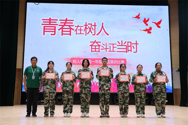 十五位选手依次上场,他们精神饱满、声音洪亮,他们气宇轩昂、意气风发,他们心中有丘壑、眉目作山河,生动诠释了树人学子神采飞扬、意气风发的精神面貌。十五位选手演讲完毕后,由年级主任汪柳老师、语文组吴昕妍老师进行点评。经过七位评委的打分,最终选出一等奖七名,二等奖八名,在此对获奖同学表示由衷的祝贺。