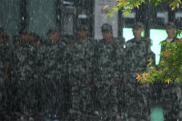 一场小雨来得不是时候,下午的军训活动被干扰,教官只得寻得一处有屋子遮挡的避雨处训练。