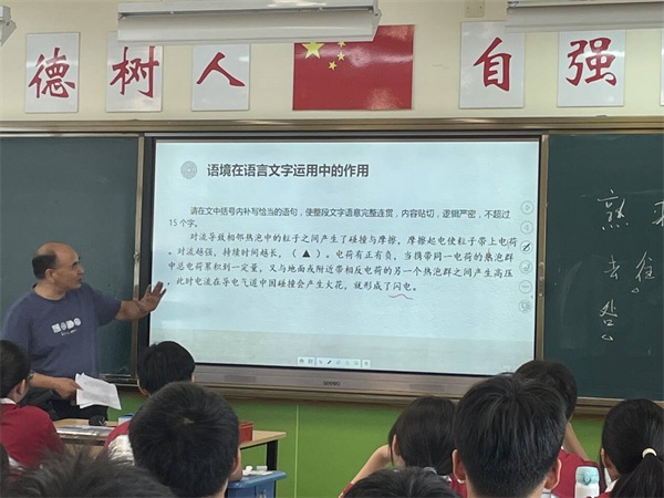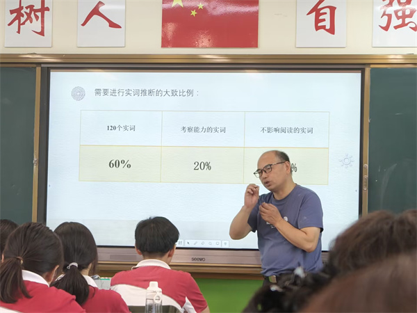 9月7日上午,王宏根博士在高三(7)班就“文言文实词推断”开展教学指导课。王老师首先邀请学生进行“零糖社交”主题演讲,及时记录关键词,对学生的演讲情况进行实时点评。随后,引领学生回顾文言实词推断方法,佯装不懂相关概念,引导学生将概念性解释内化为自己的理解并进行表达。掌握方法后,王老师及时列出相关材料,帮助学生学以致用。最后,王老师强调了语境的重要性,寄语学生:“语境是解题之基,唯君图之!”