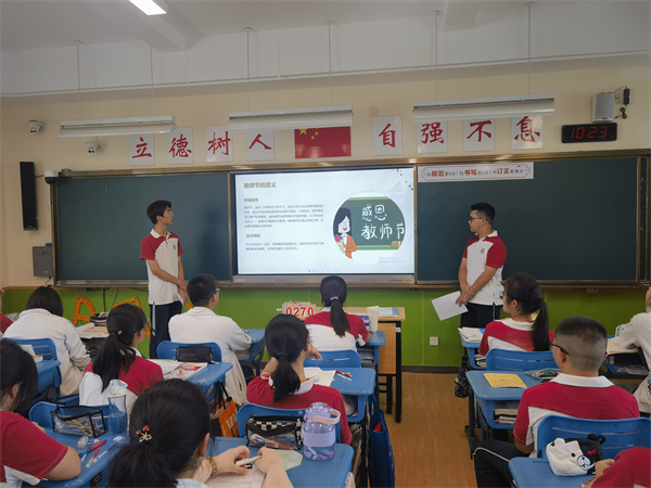 班会伊始,班主任老师首先引领学生们走进教师节的深厚历史与文化背景之中,强调了“大力弘扬教育家精神,加快建设教育强国”的时代主题。通过生动的讲解,同学们深刻认识到教师职业的神圣与伟大,以及对国家未来发展的重要意义,心中涌起对老师们无尽的感激之情。