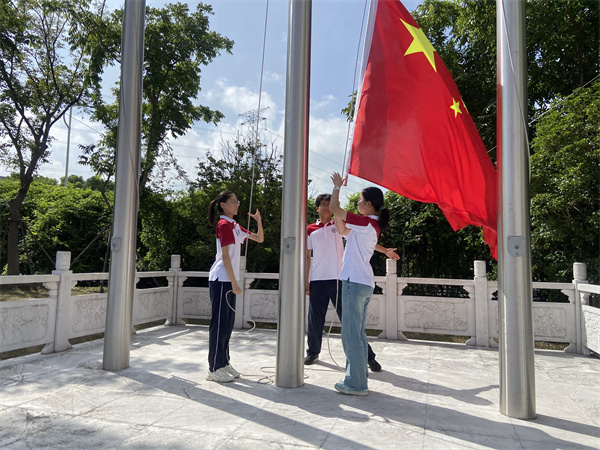 本周的升旗手是郭昀芃同学,护旗手是陈子芊和黄许晨同学。伴随着庄严肃穆的国歌,五星红旗冉冉升起,在晨曦中,迎风招展。全校师生,一齐面向国旗行注目礼,齐声唱响国歌。铿锵有力的歌声在凤栖湖上空腾飞,经久不散。