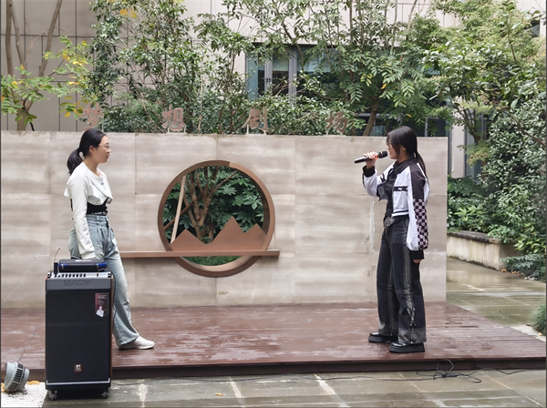 接下来,郭知源和陈新潼同学弹唱《Letting go》,悠扬的吉他声与深情的歌声交织,唱出了青春成长中的情感羁绊与释怀,同学们沉浸在那略带忧伤的氛围里。