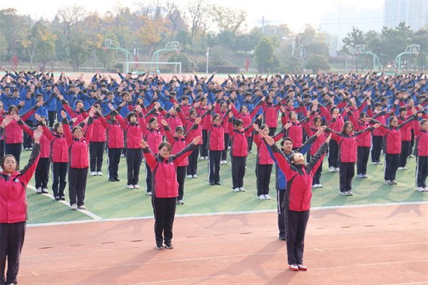 第一项考试内容是中学生第三套广播操《舞动青春》,全体同学以班级为单位组成体操队形,同学们个个精神抖擞,蓄势待发,在口令声中整齐划一,动作到位有力,向裁判老师展现了树高学子的风采。