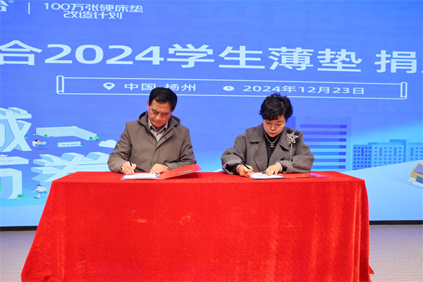 捐赠仪式上,凤栖湖校区校长朱云峰代表校方与梦百合家居科技股份有限公司扬州总经销王爱芳签署了捐赠协议。随后,与会领导向学子现场发放了床垫。