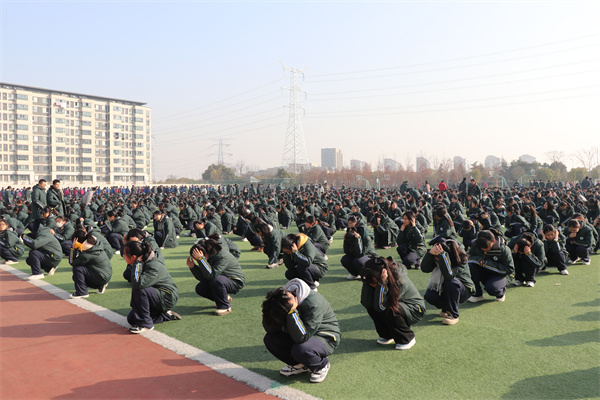 寒风凛冽,阳光和煦,在新的一年里,我校迎来了新一次的消防演练。伴随着警笛声,高一、高二、高三年级全体同学快速出教室,抱头蹲在了操场上,井然有序,排列整齐。