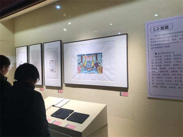 步入木版年画展厅,五彩斑斓的年画世界瞬间映入眼帘。一幅幅精美的年画仿佛带人穿越时空,回溯至旧时光的扬州街头巷尾。画中慈眉善目的老寿星手捧寿桃,身旁围绕着嬉笑玩耍的孩童,寓意着家庭和睦、多福多寿,其鲜艳明亮的色彩搭配、夸张生动的人物造型,引得同学们驻足凝视,啧啧称赞。