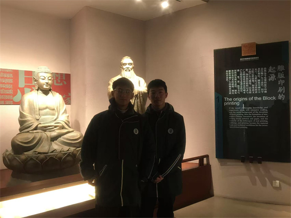 走上2楼,雕版印刷展厅入口,一组栩栩如生的雕像吸引众人目光。匠人们围坐,专注于手中活计,有的正持刀在木板上精雕细琢,木屑簌簌落下,线条于木板上渐次明晰;有的手持棕刷,蘸墨后在版上均匀涂抹,神情专注严谨,似要将毕生技艺倾注其中。这些雕像生动还原了雕版印刷制作过程。继续沿着展厅路线深入,一幅宏大的雕版印刷历史长卷徐徐展开。这让每一个同学在观展中,切身感悟到这项古老技艺从萌芽、发展到鼎盛的曲折历程。