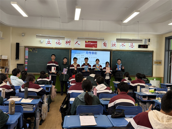 本班的月考表彰大会重点表扬了在本次月考中成绩优异的同学。通过树立这些榜样,激发同学们的学习动力,增强他们的信心,促进了班级集体荣誉感,从而对两周后的期中考试产生积极的影响。