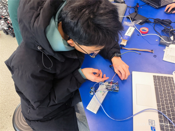 参与本次智能探索综合拓展活动的同学们在周星宇老师的指导下,开展了利用Arduino超声波智能测距并点亮LED灯的实践项目。学生们利用HC-SR04传感器实时检测障碍物距离,通过编程实现三色LED的智能响应:30cm内红灯预警、30-50cm黄灯提示、50cm外绿灯安全。实验过程中,学生团队从电路焊接、代码调试到阈值校准全程自主探索。学生们表示,最困难的不是写代码,而是让物理测量与数字信号精确同步。当LED第一次随手势准确变色时,同学们欢呼雀跃,振奋不已!本次实践项目深度融合物理声速计算、数学函数转化与编程逻辑,展现了STEM教育的核心价值。此次活动让学生们在实践中学习探索中成长,对于培养他们的科技创新精神和实践能力具有重要意义。
