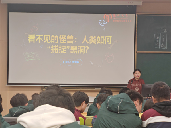 物理组邀请扬州大学引力与宇宙学研究中心在读研究生艾文娟和张旭芬赴我校做了两场黑洞科普讲座。艾老师的讲座为学生揭开了黑洞的神秘面纱,介绍了黑洞形成的原理和种类,以及如何观测看不见的黑洞等。张老师则从学术角度讲解了黑洞的理论起源与早期猜想,关键人物与理论突破,观测证据的里程碑,未解之谜与前沿研究等。学生与老师积极互动,加深了学生对于黑洞这种神秘天体的了解,激发了学生对于天体物理的学习兴趣。