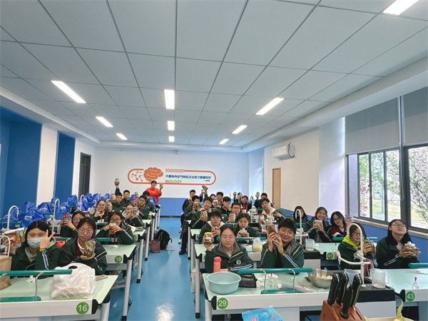 高一生物的拓展活动分为两个部分,首先由刘晓婉老师主讲。她带领学生们深入了解了利用传统发酵技术生产的食品制作过程。从酸奶的发酵原理到果酒果醋的酿造技巧,再到泡菜的制作方法和腐乳的发酵过程,学生们听得津津有味。刘老师还介绍了现代工程技术手段在食品生产中的应用。这些前沿科技不仅拓宽了食品生产的边界,也为解决食品安全、营养健康等问题提供了新的途径。活动的第二部分则是由刘娜老师带领学生们亲身体验泡菜的制作过程。学生们分组合作,从准备食材到调配调料,再到腌制泡菜,每一步都认真操作、细心观察。在制作过程中,学生们不仅学会了泡菜的制作技巧,还深刻体会到了传统发酵技术的魅力。此次舌尖上的美食活动不仅让学生们收获了知识和技能,更激发了他们对生物科学的热爱和探索精神。