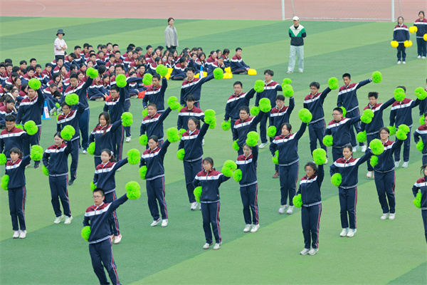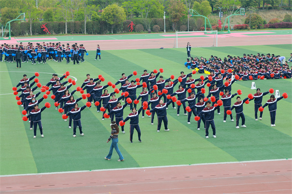 首先,14个班级分为七组,两两对决。各班同学身着统一校服,拿着色彩鲜艳的花球,精神抖擞地登场。他们动作整齐划一,充满力量与美感,每一次跳跃、每一个转身都展现出青春的活力与自信。同学们在操场上尽情挥洒汗水,用整齐的动作和灿烂的笑容诠释着对生活的热爱,赢得了观众阵阵热烈的掌声。