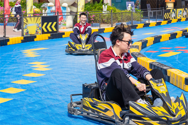 在融创乐园内,学生们可以泛舟湖上享受美丽风光,可以驾驶小车畅玩各大园区,也可以通过脚步四处穿梭。他们加快了行动,寻找自己心仪的项目。