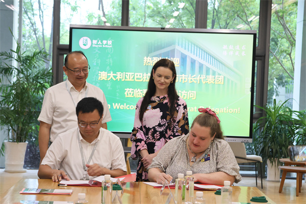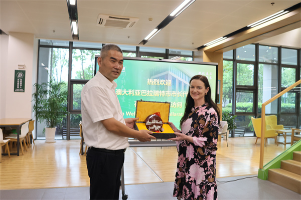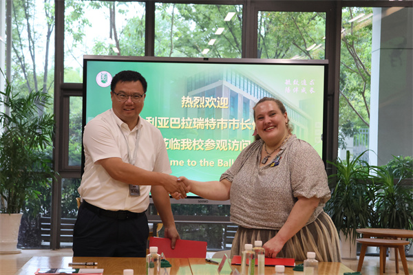 9月3日下午,澳大利亚巴拉瑞特市市长Tracey Hargreaves(翠西·哈格里夫斯)、副市长Ben Taylor(本·泰勒),巴拉瑞特文法学校代表Scarlett McLean(斯嘉丽·麦克林)一行8人,在市外办副主任夏莹、美大处副处长缪经和市教育局四级调研员张金生等陪同下,莅临我校凤栖湖校区参观访问,树人学校党委书记唐炜,校长赵涛,副校长张鹏、徐建等热情接待并陪同参观交流。