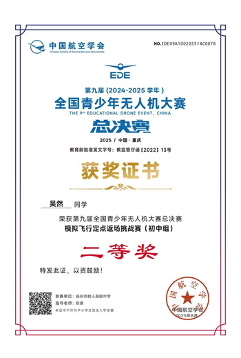 在全国总决赛中,我校学子表现优异:沈琪渊、陈士喆、姜锦文、吴然同学荣获模拟飞行定点返场挑战赛(初中组)二等奖;韦彦峰、江新尧同学荣获三等奖。
