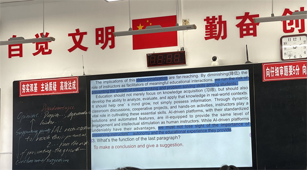 英语展示课由栟茶中学唐清青老师执教,以必修三Unit3“The world online”为主题,教学设计层层递进。课堂上,唐老师以DeepSeek相关情境导入激活学生已有知识,后通过一篇“将AI引入教育领域”主题的议论文,引导学生进行略读、精读训练,精准捕捉文本关键信息。在写作环节,采用“范文赏析—结构拆解—分层练笔”模式,结合教师点拨,有效降低写作难度,激发学生表达热情。整堂课注重读写结合,将语言输入与输出有机融合,充分体现了以学生为中心的教学理念。