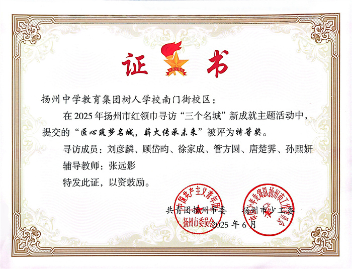 近期,我校南门街校区在2025年扬州市“红领巾寻访‘三个名城’建设新成就”主题实践活动中,提交的“匠心筑梦名城,薪火传承未来”的寻访案例,被评为特等奖。