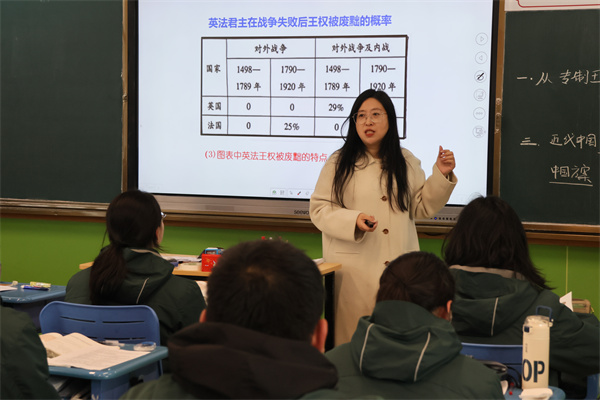 蔡老师以“为荣誉而战”为主题,从巴黎奥运会会徽的文化符号切入,通过精心选取的史料、图表与热点关联,引导学生逐步探究近代民族国家观念的形成与国际法的演进历程。课堂最后落脚于台湾问题的现实探讨,强化历史与当下的联结,有效提升了学生的国家主权意识与时代责任感。邓老师则以中国致函联合国的新闻视频导入,从“国际秩序演进”的宏观视角展开教学。通过任务驱动、材料辨析与表格梳理,帮助学生系统构建知识体系,并在总结中引导学生思考全球治理与人类命运共同体的当代意义,体现了历史教学的价值引领功能。