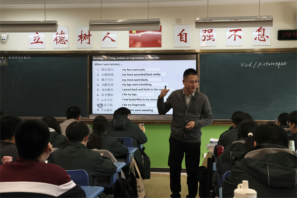 蔡小军老师以“语言可视化”为教学主线,通过短视频解构人物表情与动作细节,结合“with复合结构”“独立主格”等句法支架,引导学生将生活观察转化为规范、精准的书面表达,教学过程紧密衔接高考写作要求,注重段落建构与语言规范性的同步提升。许文凭老师则以“情感情境化”为推进逻辑,选取《小谢尔顿》典型片段创设学习情境,设计“情节补全”任务链,引导学生在还原角色情绪过程中自然运用目标语言,注重表达的画面张力与情感真实感,有效激发学生的创作代入感与表达欲。