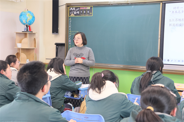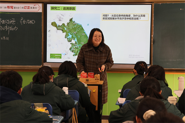 栟茶高级中学杨蓓蓓老师则从江苏高校分布、产业结构、交通布局等专题地图入手,引导学生通过地理要素认识苏南苏北发展差异并追溯其成因。在学生表达过程中,她结合高三复习需求,引入“思维结构评价表”,帮助学生构建逻辑清晰、表述规范的思维链条。随后,她进一步从历史视角展开,分析长江与黄河流域的水资源与流域特征对苏南、苏北发展的深远影响,旁征博引,拓宽了学生的地理视野与思维纵深。