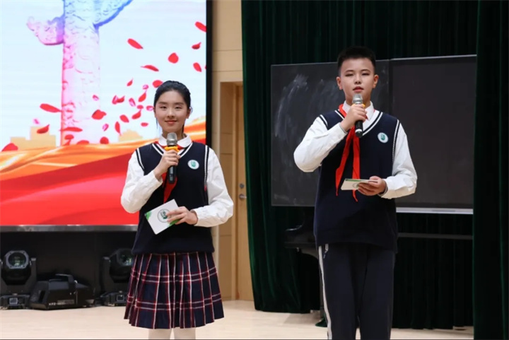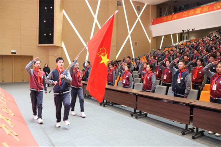 大会在雄壮激昂的国歌声中拉开帷幕,少先队员代表九龙湖校区 2024级曹语彤、韩晓东同学主持会议。伴随着铿锵有力的出旗曲,旗手们精神抖擞、昂首阔步,迈着整齐的步伐展示队旗风采,充分彰显了新时代少先队员朝气蓬勃、积极向上的精神风貌。现场全体少先队员身着整齐队服,以挺拔的身姿、嘹亮的队歌、严明的队风队纪,向队旗致以最崇高的敬意,表达对少先队组织的无限热爱。